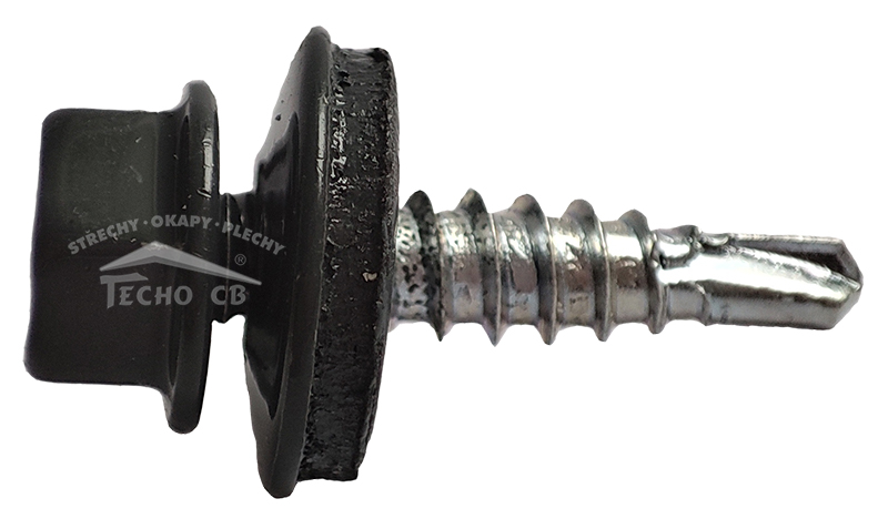 Pozinkovaný lakovaný farmářský střešní šroub/Tex 4,8 x 20 mm šestihran. Používá se pro kotvení plechové krytiny do dřevěných konstrukcí a spojování plechových krytin.