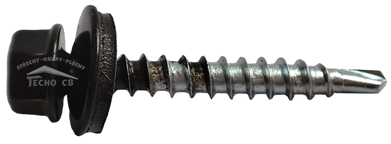 Pozinkovaný lakovaný farmářský střešní šroub/Tex 4,8 x 35 mm šestihran. Používá se pro kotvení plechové krytiny do dřevěných konstrukcí a spojování plechových krytin.
