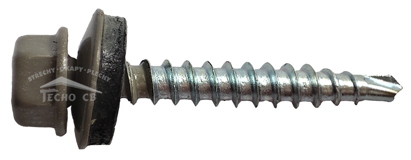 Pozinkovaný lakovaný farmářský střešní šroub/Tex 4,8 x 35 mm šestihran. Používá se pro kotvení plechové krytiny do dřevěných konstrukcí a spojování plechových krytin.